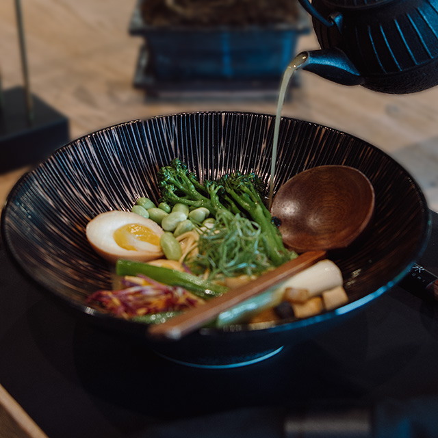 Boiled chicken breast - poached Leogang organic egg - shiitake - edamame - pak choi - carrot